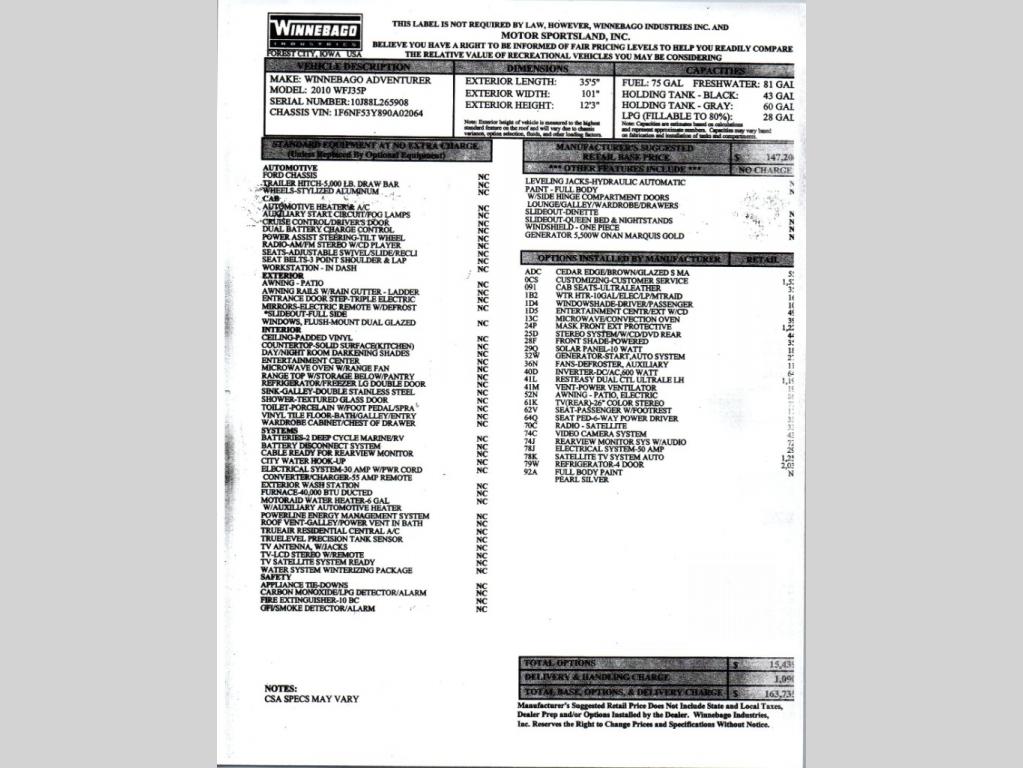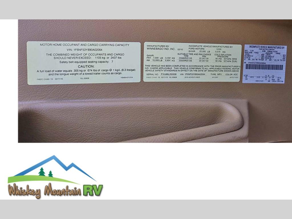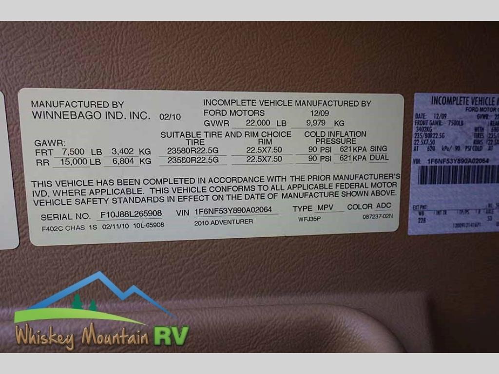 2010 WINNEBAGO ADVENTURER 35P - 3 SLIDES INCLUDING FULL WALL SLIDE. BUILT ON FORD'S F53 CHASSIS RATED AT 22,000 LBS WITH A 5,000 LB HITCH. BRAND NEW TOYO TIRES UPGRADED TO A WIDER 245/75/22.5 FOR BETTER STEERING STABILITY. THE WHEELS ARE POLISHED ALLOY WHEELS - NOT HUB CAPS.