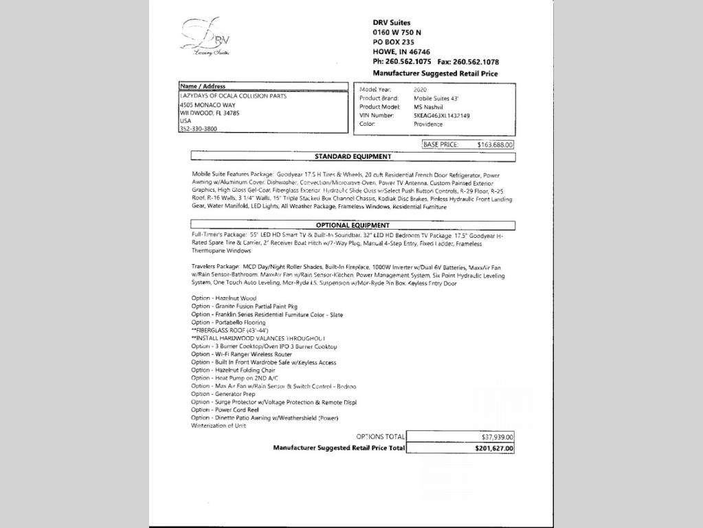 THIS CUSTOM ORDERED ONE OWNER UNIT WAS BUILT 12/9/2019 AND ORIGINALLY SOLD IN WILDWOOD, FLORIDA. WE BOUGHT THIS UNIT DIRECTLY FROM THE ORIGINAL OWNER IN BATON ROUGE, LA. THE TIRES ARE BRAND NEW AND HAVE BEEN UPGRADED TO 235/75/17.5". THE ORIGINAL MSRP SHEET, INCLUDED IN THE PICTURE SECTION, LISTS FACTORY OPTIONS INCLUDING A FIBERGLASS ROOF AND FACTORY COLORS. TOTAL MSRP WASJUST UNDER $202,000. THE PREVIOUS OWNER ADDED A WASHER / DRYER, MOR/RYDE STEPS AND TOOL BOX.. THE LIVINGROOM LOUNGE CHAIRS ARE BRAND NEW.