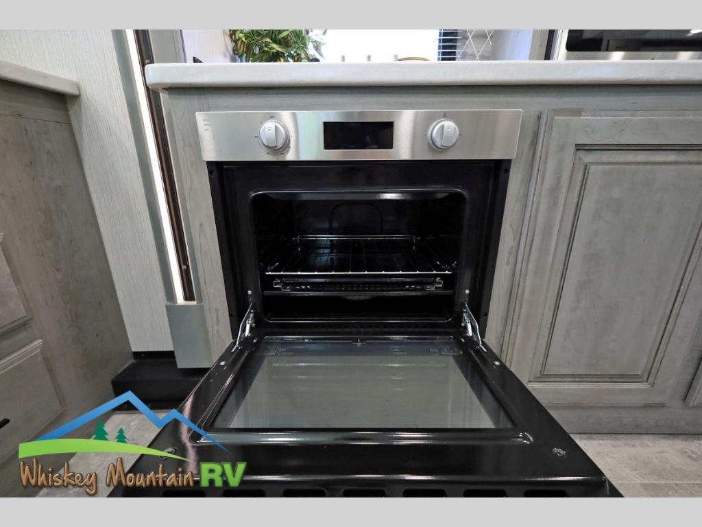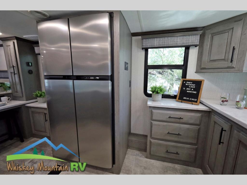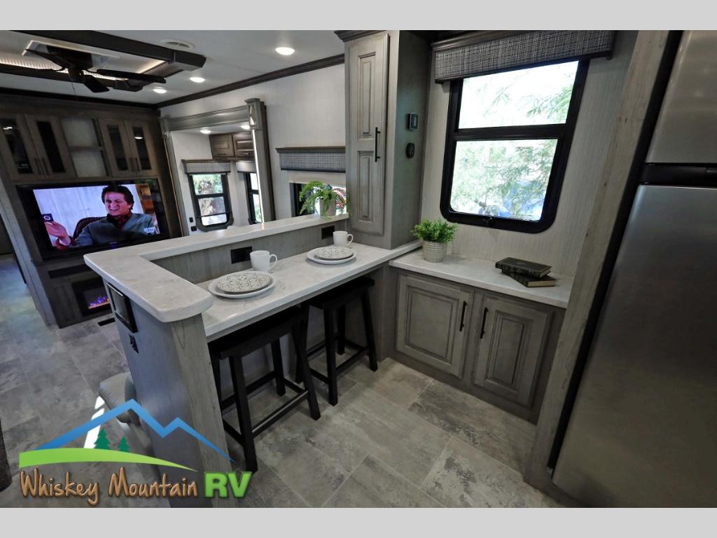 You will be amazed at all this fifth wheel has to offer! From the front raised kitchen with lots of counter space, the large, deep pantry, and breakfast bar counter with two bar stools overlooking the living and dining area to the spacious rear bedroom. The living area has a flip and fold sleeper sofa for you to take an afternoon nap on or relax at the power theater seating while others play card games at the standard dinette slide which can be switched out for the optional sofa. After a fun-filled day outdoors, head to the full bathroom and take a nice, hot shower in the shower with a teak seat. The rear private bedroom welcomes you to a good night's rest on the king bed slide, and if you choose to add the optional washer and dryer then you can have clean clothes throughout your entire trip!
