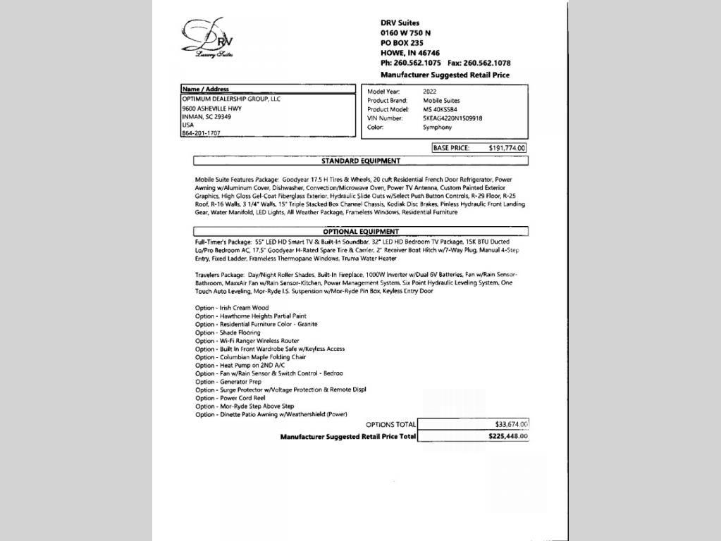 THIS ONE OWNER UNIT WAS BUILT ON 6/10/2022 AND FIRST SOLD IN INMAN, SC. WE BOUGHT IT FROM A DEALER IN TEXAS. THE ORIGINAL MSRP SHEET IS LOCATED IN THE PICTURE SECTION OF THIS AD. MAJOR FACTORY OPTIONS INCLUDE 2 A/C HEAT PUMPS AND MOR/RYDE STEP ABOVE. IT WILL BE FULLY SERVICED FROM IT'S RUBBER ROOF TO IT'S KODIAK DISC BRAKES PRIOR TO DELIVERY.