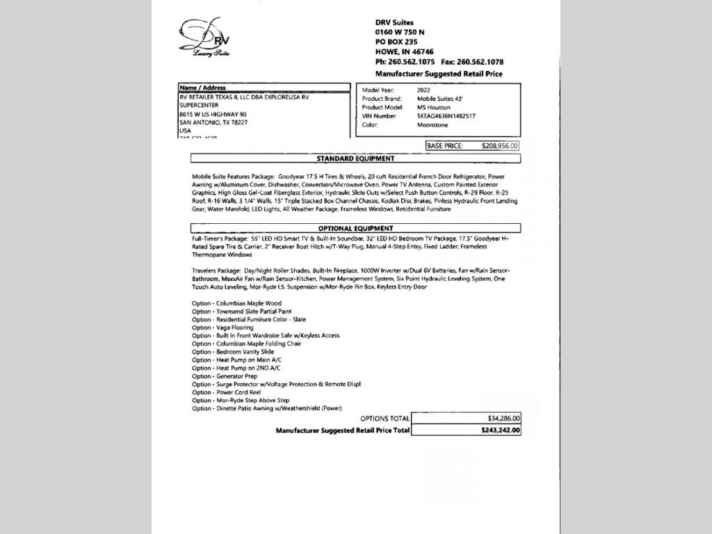 THE EXTERIOR COLOR IS DRV'S TOWNSEND PARTIAL PAINT PACKAGE WITH FULL BODY CLEAR COAT. THE INTERIOR IS DRV'S MOONSTONE DECOR WITH COLUMBIAN MAPLE HARDWOOD CABINETRY. DEALER INSTALLED OPTIONS INCLUDE 5.5Kw ONAN LP GENERATOR, SPLENDIDE WASHER AND DRYER, 3 CAMERA SYSTEM AND A SLIDE OUT TRAY. A COPY OF THE ORIGINAL MSRP SHEET FOR JUST OVER $243,000 IS INCLUDED IN THE PICTURE SECTION.